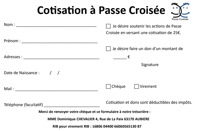 Samedi 18 Avril, le bureau de PASSE CROISEE se réunira à la maison des associations de Chamalières.